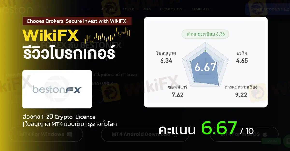โดยสรุป โบรกเกอร์ BestonFX มีคะแนนประเมินบน WikiFX อยู่ที่ 6.67/10 อย่างไรก็ตาม โปรดใช้วิจารณญาณในการตัดสินใจ การเลือกใช้โบรกเกอร์ขึ้นอยู่กับวิจารณญาณของแต่ละบุคคล ควรอ่านรีวิวจากผู้ใช้งานจริง ศึกษารายละเอียดต่าง ๆ ให้ดี และระวังความเสี่ยงที่อาจจะเกิดขึ้น อ่านข้อมูลเพิ่มเติมเกี่ยวกับโบรกเกอร์คลิก https://www.wikifx.com/th/dealer/1551413325.html?source=syrc