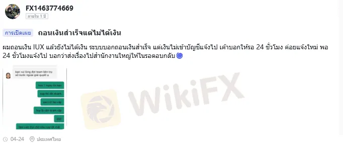 จากข้อมูลรีวิวบนเว็บไซต์ WikiFX แอดเหยี่ยวพบว่ามีผู้ใช้งานจำนวนหนึ่งเข้ามาแสดงความคิดเห็นเกี่ยวกับประสบการณ์ใช้งาน IUX โดยประเด็นที่ถูกกล่าวถึงบ่อยคือเรื่องการถอนเงินและการติดต่อฝ่ายสนับสนุน ผู้ใช้งานบางรายระบุว่าการถอนเงินใช้เวลานานกว่าที่ระบบแจ้งไว้ และคำขอถอนเงินค้างอยู่ในสถานะรอดำเนินการเป็นเวลาหลายวัน