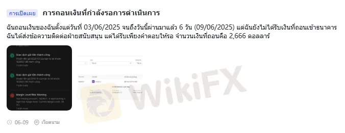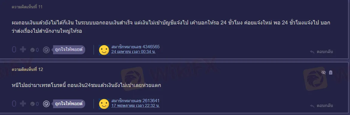 ผู้ใช้งานบางรายเล่าว่าต้องรอการถอนเงินตั้งแต่หลายวันไปจนถึงหลายสัปดาห์ โดยบางกรณีระบบแจ้งว่าถอนเงินสำเร็จแล้ว แต่เงินยังไม่เข้าบัญชีจริง เมื่อสอบถามไปยังฝ่าย Support ได้รับคำแนะนำให้รอการตรวจสอบเพิ่มเติมโดยยังไม่มีกำหนดเวลาที่ชัดเจน