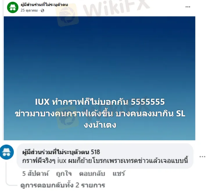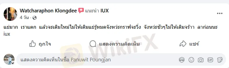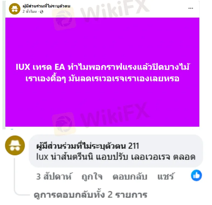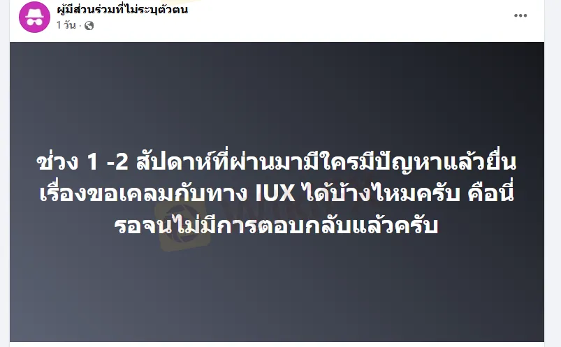 บน Facebook Page อย่างเป็นทางการของ IUX แอดเหยี่ยวพบว่ามีรีวิวจากผู้ใช้งานหลากหลาย ทั้งในเชิงพึงพอใจและเชิงกังวล โดยรีวิวเชิงลบส่วนหนึ่งสะท้อนปัญหาเกี่ยวกับการฝากและถอนเงินที่ล่าช้า ผู้ใช้งานบางรายระบุว่าระบบแสดงสถานะทำรายการสำเร็จแล้ว แต่เงินยังไม่เข้าบัญชีจริงตามเวลาที่คาดไว้