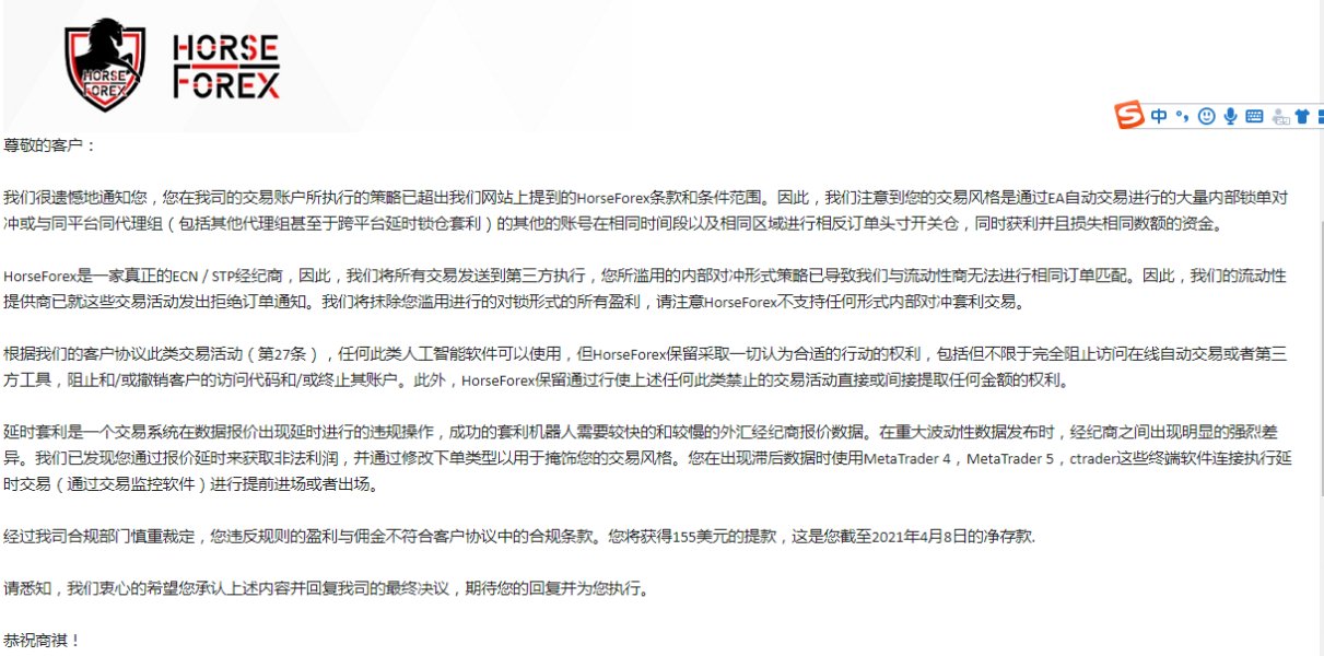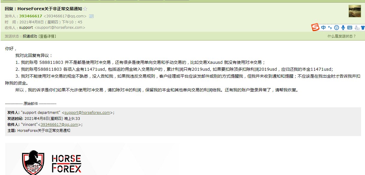 马汇Horseforex 编造理由不给出金,还封禁后台和交易账号, 还有12155.8 usd不给出金。发邮件不回,联系在线客服也不解决,从2021.4.08至今已有18天了,