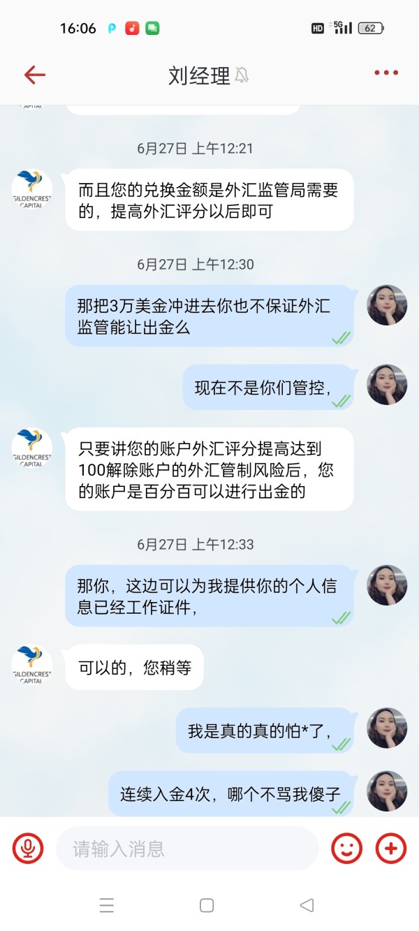 我被1个托带单1个股票群,然后股票群推理股票,后来群主就推荐国家黄金说很赚钱,开始我没做,他们在群里天天分享怎么赚钱,还在群里发红包,就是让大家做他那个黄金,有的人做1星期就翻倍了,我开户入金也赚了,群里1个鲲鹏老师说他有软件一键跟单,操作快可以赚钱,我犹豫了,问了带我进群的托他说给鲲鹏操作了安全没问题还能多赚,我傻也给鲲鹏操作,开始几天也赚钱,在6月18号晚上重仓买入,到第二天我一看满仓对冲不能平仓,然后平台刘经理不停让入金不然亏损,我为了平仓不停凑钱进去,不了7万多美金才把仓平了,然后不能出金,刘经理又要5万解除多地登录被盗风险才能出金,我是看那么多本金了也只有再入金,最后还是不能出金,这个黑平台那天坑了很多人