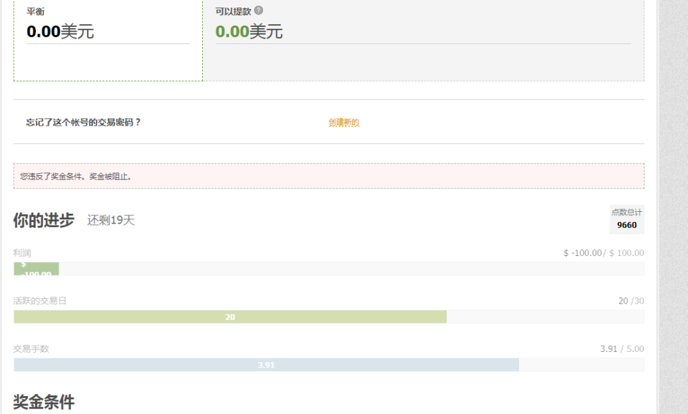 FBS所谓赠金100,提取条件极其苛刻,极大部分人可能都拿不到,50天内需要完成5手,需要30个活跃日,每次最多0.01,同时最多5单,订单盈亏需要超过100微点才被承认。但这样就算了,在我差不多完成要求的时候,强行出金,后台查看显示违规交易,然而实际上我尝试过违规的交易订单根本开不出来。在这里我劝告使用FBS的朋友赶紧出金,没入金的不要去尝试,当然如果你想玩这100赠金的到可以试试,但是只是浪费时间而已,呵,FBS当真无耻