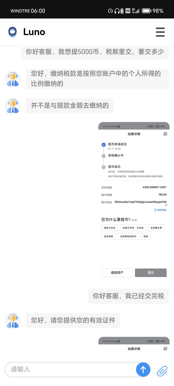 LUNO诈骗交易平台!他们设计的交易平台完美漂亮,容易操作,极具欺骗性!我经过充值交易感觉很不错,偿试出金被阻止,需要先缴税,不能从帐户里扣除,缴完税了,又要我交什么违规金!他们毫无顾忌,继续随时可以保持客服沟通,保持继续诈骗通道!我被冻结帐户金额:55,434.03396USDT 诈骗平台