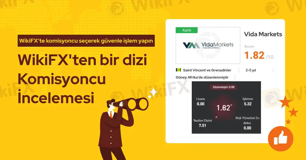Vida Markets resmi lisans sahibi bir forex komisyoncusu değildir ve WikiFX araştırmalarına göre bu firmanın lisansı geçerli değildir. Ayrıca bu firmayla ilgili olarak son 3 ayda 16 farklı şikayet WikiFX yetkililerine ulaşmıştır. Bundan dolayı WikiFX bu komisyoncuya 1.82/10 gibi düşük seviye bir puan vermiştir.