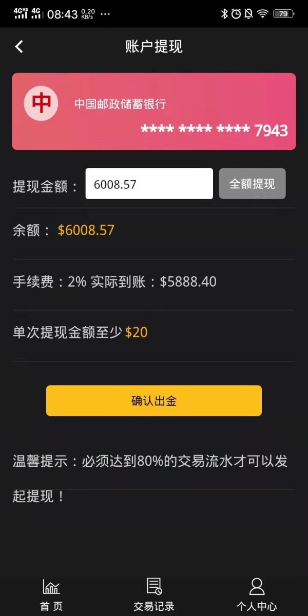想要提现,上面显示当天交易流水要超过80%的流水,我又去找客服,客服说申请提现要5到7个工作日才能提现,结果我20号提现到今天都7天还不到帐,这是骗人机构吗