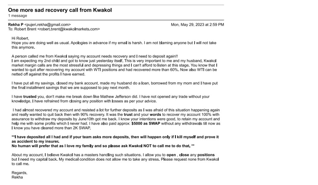 I got some AD on Robotic trading and clicked on link, immediately got call from Kwakol (phillip.williams@kwakolmarkets.com) and person asked me to invest refundable deposit of $250 where robot will do its job of trading will have every day profit as they scheduled and programmed. I was also assigned Finance advisor called Alexandar who said will teach me trading. Few trades they did where my account showed profit of $50+ profit and later there were some trades that were going negative, and they were positions were not stopped. I followed up and there was no response. I left for month due to my exams this happened DEC2022 month. Later person named Mathew called me on Jan 26th 2023 (Mathew.Jefferson@kwakolmarkets.com). He introduced himself well and said he is 10-15 yrs experienced in this field and can teach me trading and I will also earn profit and will withdraw twice a month etc. He also told he has never traded with $250 and would need more than $1K in my account. He convinced me to put $1750 where he said will add some bonus that I can use for trading. First thing he asked me to trade was WTI, most volatile and risky instrument. I was completely newbie and it was my first time in trading. He showed me Inventory report and asked me to trade accordingly. Few trades worked and few did not. I also made some test withdrawal of $300+$100.Later all my trades started going in negative. He asked me to open WTI trades with volume 100 max, told not to be afraid and keep opening the trade till my margin is 200%. I just followed and later when trades went opposite direction margin started going down and some I closed loss trades against profits. I approached Mr.Mathew for help and he advised me not to close with losses instead to deposit more. In order to save $1750, I deposited $2250 and till e assured he will work and save my account. Did not turn up after several emails. He replied saying he is busy with his new position would assign someone to help me and never did. I have his email where he clearly says he has been ignoring his clients due to his new role and responsibility else my account could have been recovered with minimal help. After point he stopped replying and I again got margin call :-( I can't explain the stress I went through, and I have 3 yrs old kid to look after. By then I had deposited $10,028 to recover my capital :-(. Trust me I did not have any withdrawal apart from the test withdrawal of $300+$100=$400.   Later person called Robert pitched in "robert.brent@kwakolmarkets.com" said he is recovery manager for Kwakol and they are only 4 people in entire company and will help me recover my account as it was in RED Alert. He spoke for more than 2hrs and end of conversation same thing, asked me to deposit more to recover :-(. He suggested 3K deposit I did not have and he put some $500 as bonus and kept insisting me to deposit. He took one week showing his expertise, skills, placed some trades and showed me how profit can be made. He said Mr.Mathew was sales agent whose job is to get more deposits from client while Mr.Robert is permanent employee and very senior person. He assured these things will not happen and I will recover my account if I listen to him. It was so stressful, and I did not want to loose $10,028 so I had to deposit $3K(First I did 1K and after seeing he has tine for my account, I did 2K) to save my account. Started doing small trades where my margin moved to 400%. Equity started showing 40 to 50% recovery. Robert kept believing only one thing that is US Recession is coming and Gold will move up and Nasdaq will drop down. He showed some web links which did not clearly say though. Also he said never trade on WTI and half hedged WTI positions (Bought when it was 80+) and told not to trade on WTI as its volatile. Did not allow me to close BUY positions even though WTI was moving down. All he said was we will make good profit and then close the trades with losses :-(  Slowly he started saying as am recovering my account I will be handed over back to someone and he is afraid I will get back to same situation. For that I told I will close my account once I recover my capital, I am not even looking for single dollar profit. I said I will come back only when I learn.  He said, "He does not want to lose such potential client like me and showed how much Gold can make for me and I will be out of this mess in month if I listen to him". His proposal was to put 5K more when I had already put 15K+.He said I will be assigned to someone else as he handles people only with 50K+ deposits as he being senior account manager and told I would continue with his account ship if my total deposit is 10K under him.He kept calling me, following up. I denied over call, over emails and stopped picking few times, gave some excuses too. Finally, one fine day he gave written confirmation that by June 10th I will withdraw 10K amount and my equity will be 30K. He also ensured over call I will not have single trade in Loss (Kwakol has recorded calls they can always review). He also gave me confirmation that apart from 10K I will withdraw twice month, I will be completely out of this mess. I had second baby plan hence me and my husband took call to get over this mess as Robert seemed genuine, God believing person, told he would swear on his daughter etc. He also advised to use credit card or do loan as its matter of just one month. So I went extreme closing my bank account, one of fixed deposit, borrowed from my mom and my husband made some personal loan as well. We accumulated and did multiple deposits. USD to my country currency is 82.X hence its huge huge amount I risked. I still remember Robert was awake around 2.30am of his time until I made my last deposit :-( ($20452 is the total deposit I made till now apart from my initial $250 refundable deposit)This dedication was never there after I deposited. He asked me to open Gold BUY position when it was already at its resistance. He kept sayin