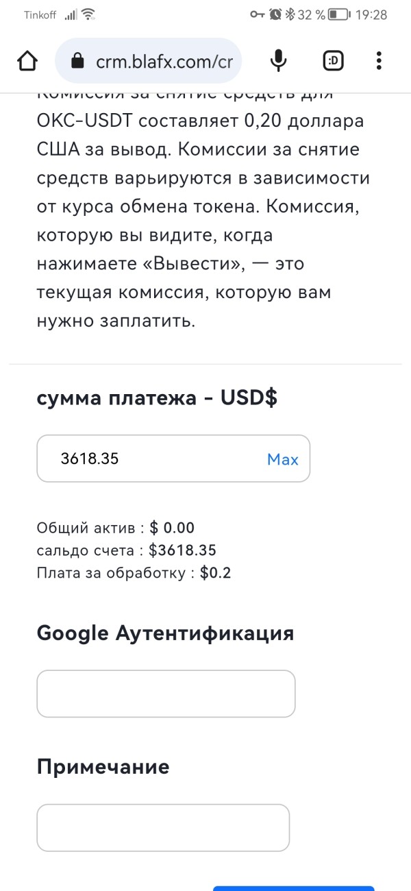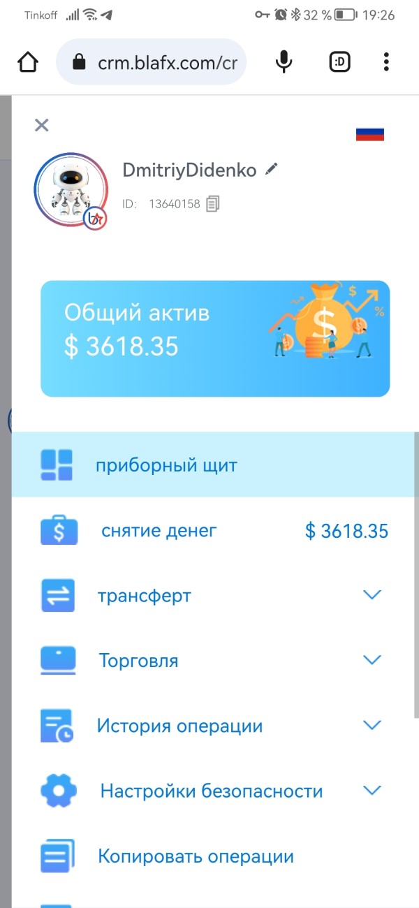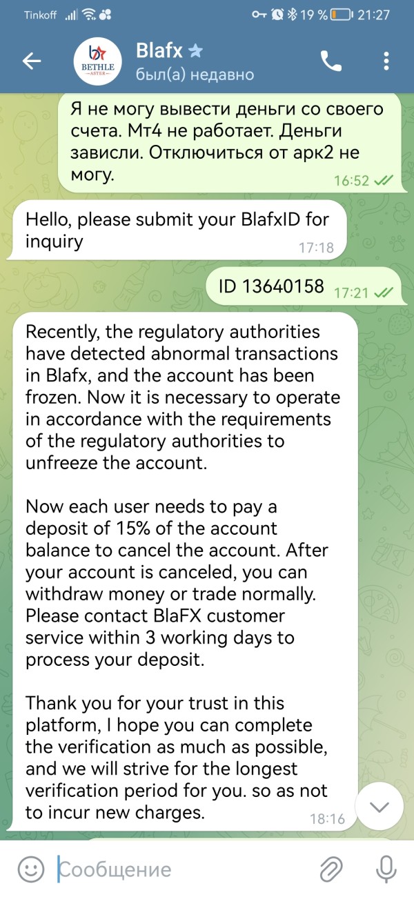 В blafx мой ID 13640158. Номер счета 5542867. Сумма на счёте 3618,35$. Счёт заморожен. Деньги не могу вывести. В тех службе говорят что счета все заморожены и требуют внести ещё деньги. Считаю их мошенниками. Прошу разобраться с компанией blafx и вернуть мне все деньги с моего счета.