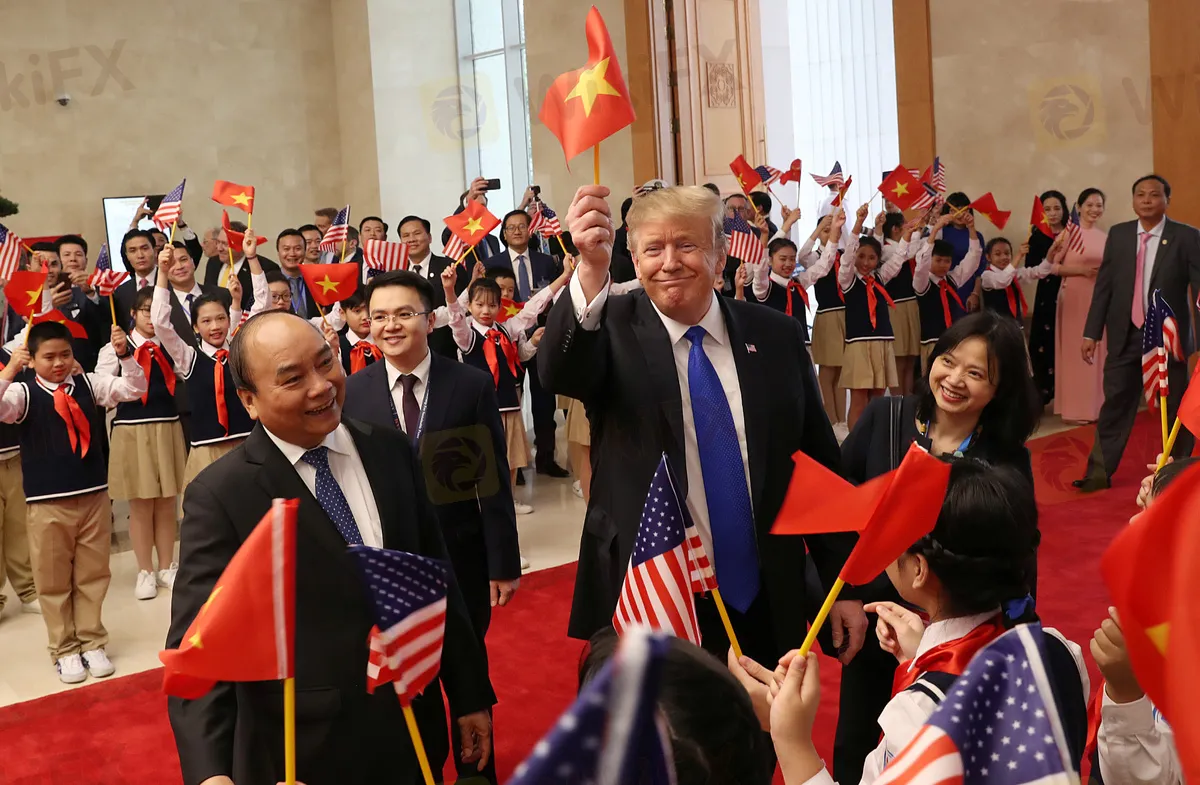 Tổng thống Trump vẫy cờ Việt Nam khi gặp Thủ tướng Nguyễn Xuân Phúc tại hội nghị thượng đỉnh Mỹ - Triều hồi tháng 2 năm ngoái. (Ảnh: NBC)