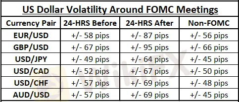 Dữ liệu giao dịch của EURUSD, GBPUSD, USDJPY, USDCAD và AUDUSD kể từ năm 2008 cho thấy sự biến động của USD trước và sau quyết định của Fed đều cao hơn bình thường. Do đó, các nhà giao dịch ngoại hối nên duy trì cảnh giác cao độ trước thời điểm nghị quyết của Fed được chính thức công bố.