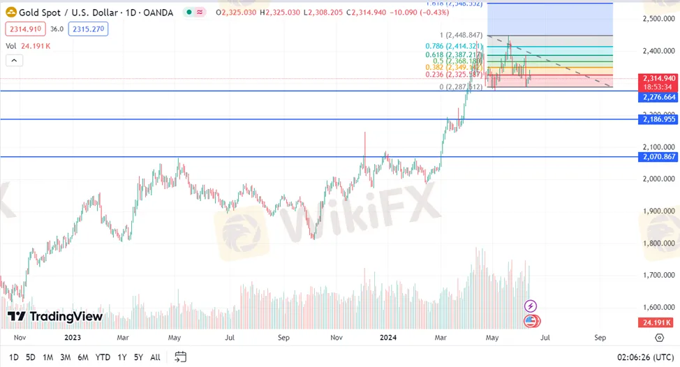 Giá vàng đang chuyển sang xu hướng giảm với đường 50 MA cắt xuống dưới 200 MA và RSI đi xuống dưới mốc 50. Chúng tôi tìm kiếm mức quan trọng quanh khu vực 2275. Nếu giá giảm xuống dưới mức 2275, chúng ta có thể kỳ vọng giá sẽ tiếp tục giảm và chạm ngưỡng kháng cự trước đó là 2200 và 2000. Nhìn vào mức thoái lui Fibonacci, chúng ta thấy 2325 là một điểm vào lệnh tốt cho xu hướng giảm.