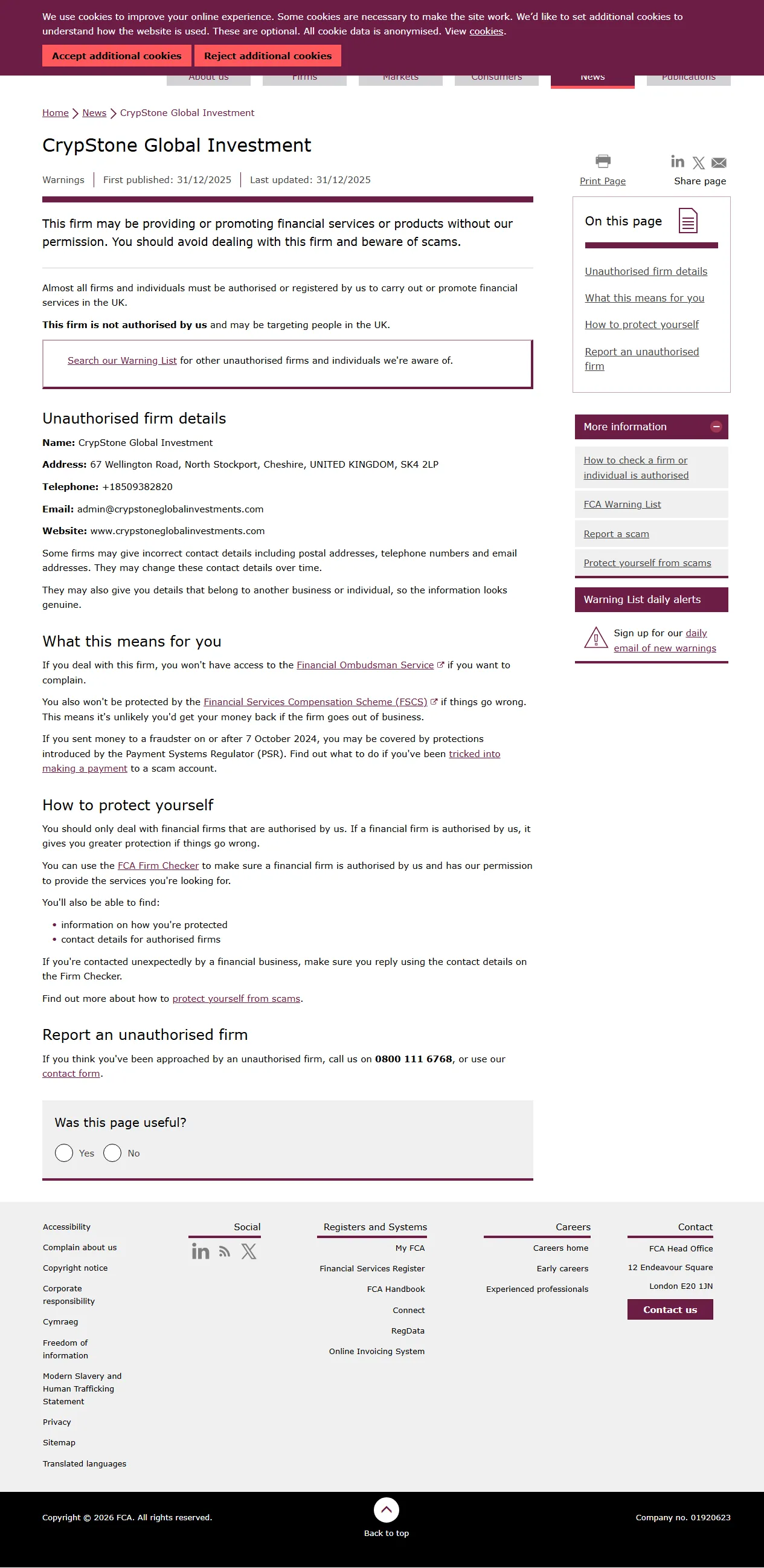 Danh sách Cảnh báo FCA về các công ty không được ủy quyền CrypStone Global Investment.