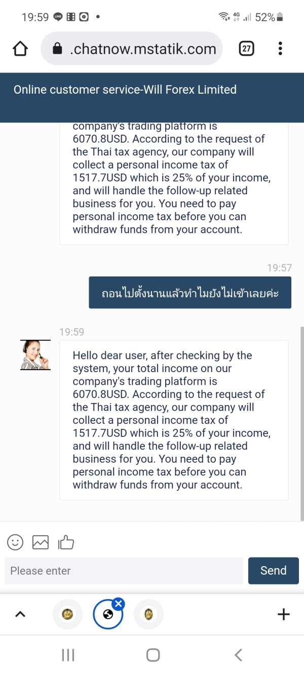 Will forexแจ้งว่า ต้องเสียภาษีจากกำไร 25% พอเติมเงินไปเพื่อเสียภาษี ถามว่า ยืนยันไหมคะว่าถ้าเสียภาษีจะถอนได้ทั้งหมด เค้าก็ตอบว่า yesเราก็เติมเงินเลย คราวนี้มันตอบมาอีกว่า สวัสดี โอเค บริษัทของเราจะจัดการเรื่องภาษีให้กับคุณในเวลาทำการในวันที่ 17 มกราคม หลังจากเสร็จสิ้นธุรกิจการชำระภาษี เราจะแจ้งให้คุณทราบทางอีเมล โปรดอดใจรอ และขอให้คุณมีความสุขในชีวิต พอถามอีกวันนี้ ให้เสียภาษี 15% จากยอดทั้งหมดที่ถอนออก ถึงจะถอนได้ คือโดนโก่งแน่คะ ยืมเงินแม่มาเพื่อเสียภาษี แต่ไม่ได้อะไรเลยคะ