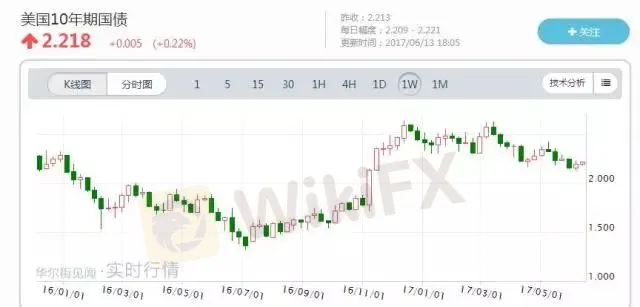 最新数据显示,截至北京时间6月13日18:05,美国10年期国债收益率最新报在2.218%,与之前今年3月第二周创出的2.630%这一高点(2016年至今的最高水平)相比,回落了0.412%或41.2个基点。