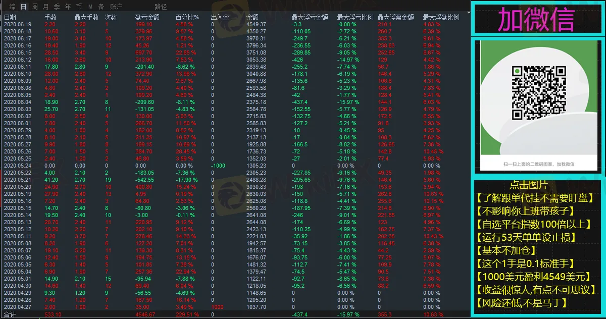 摘要:道指收割者,单单有止损,不加仓,自动化跟单,月收益100-200%左右