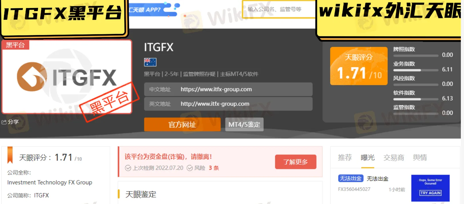 这两天外汇天眼收到多起ITGFX平台的投诉,称其公司监管不利,要求赔偿所有本金损失,2021.7月经朋友介绍进入该公司平台进行操作,没过多久就无法出金,2022.7.19,该公司公布账户被黑客攻击,爆仓,希望外汇天眼帮追回损失。另外有受害者称,该平台是突然进不去的,现在不知道怎么回事,仿佛ITGFX一夜之间突然崩盘,一夜之间所有数据消失了。