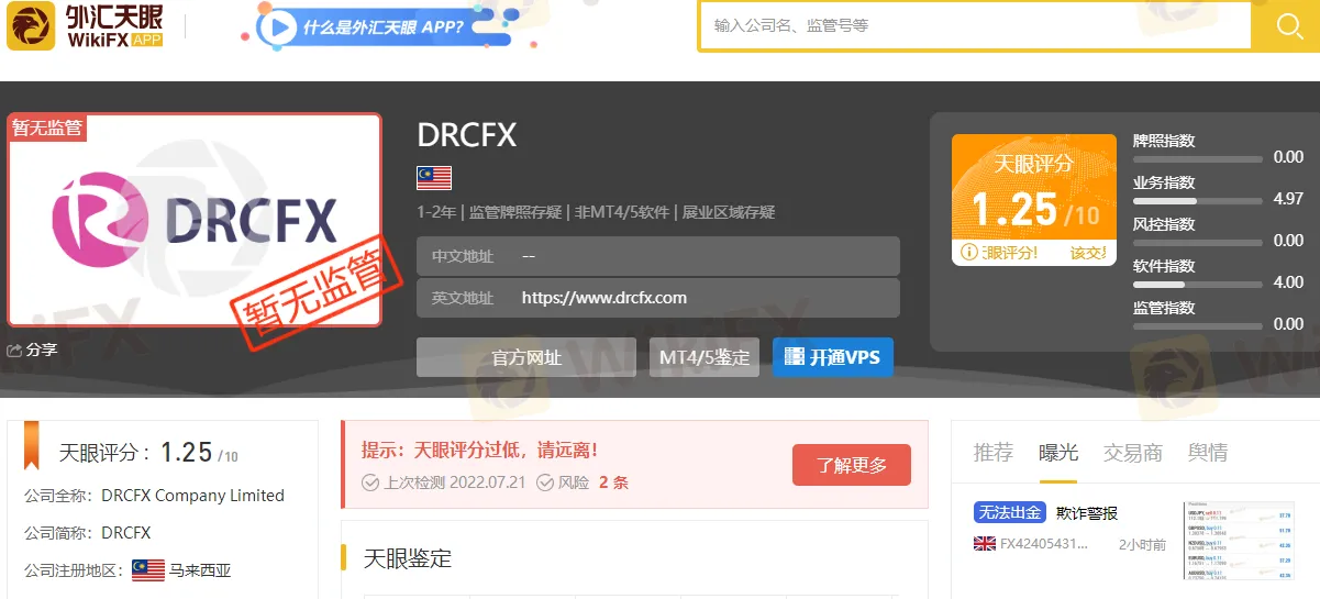其实有很多方法可以避免出现这样的情况,在做外汇和其他交易之前,可以在我们外汇天眼上面先检索一下该平台是否可靠,就拿DRCFX平台举例,在天眼首页搜索DRCFX可以得出如下结果: