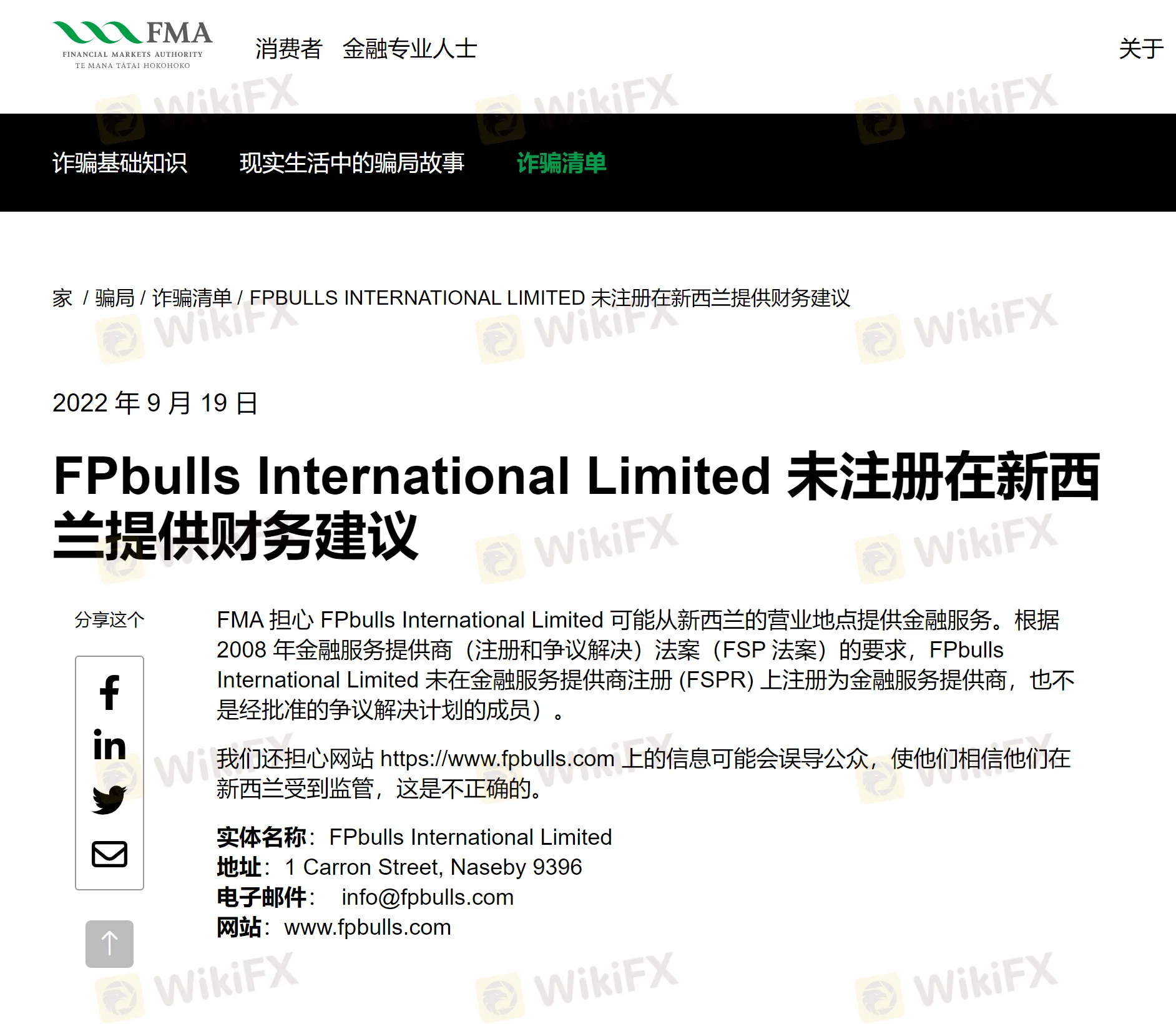 9月19日,新西兰金融市场管理局(FMA)官网诈骗名单内新增——FPbulls International Limited。