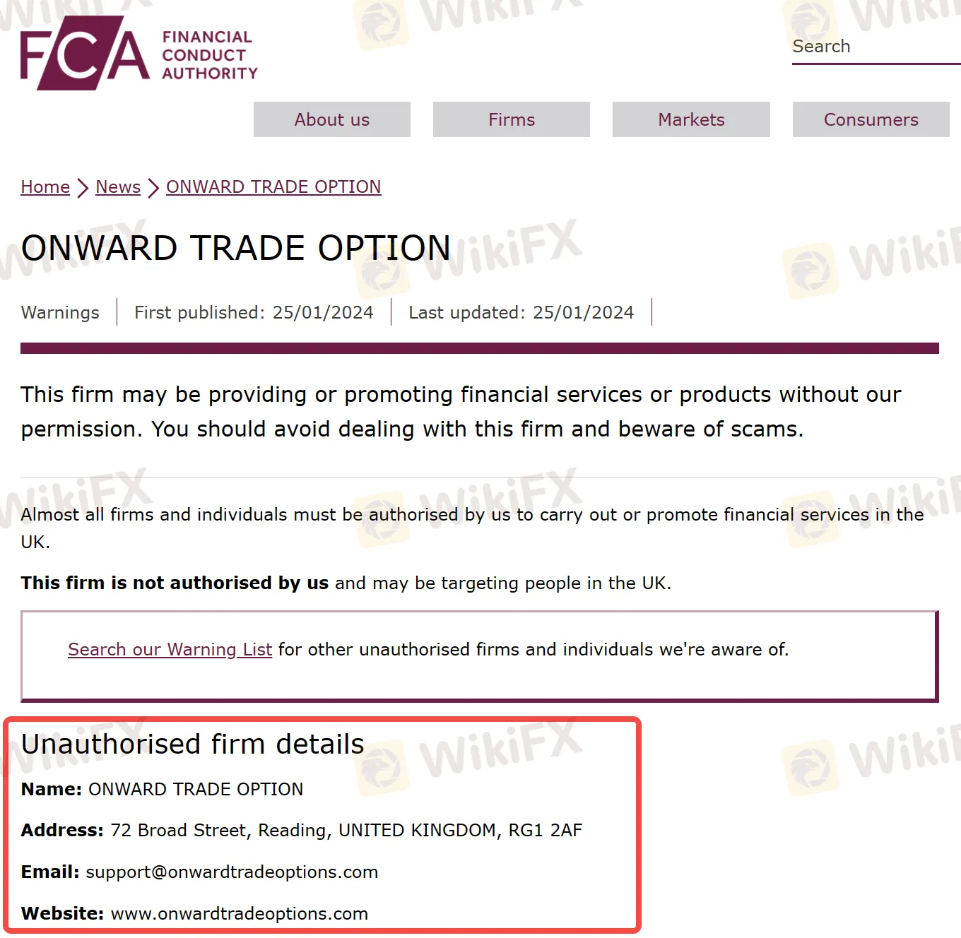 FCA认为ONWARD TRADE OPTION存在欺诈投资者、非法集资等严重违法行为的可能。并警告投资者不要与该公司进行任何交易或投资,如果一旦遭受资金损失,将无法使用金融申诉专员服务或受到金融服务补偿计划 (FSCS) 的保护。