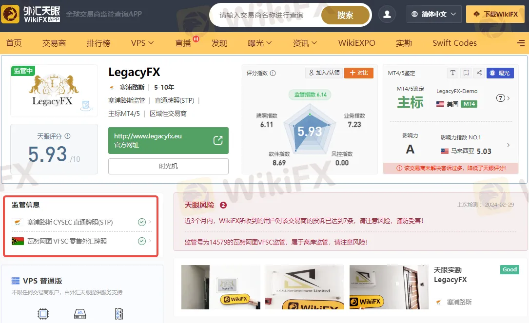 通过外汇天眼查询可知,LegacyFX目前受塞浦路斯证券交易委员会(CySEC)和瓦努阿图金融服务委员会(VFSC)监管。持有塞浦路斯证券交易委员会(CySEC)直通牌照(STP)以及瓦努阿图金融服务委员会(VFSC)零售外汇牌照。
