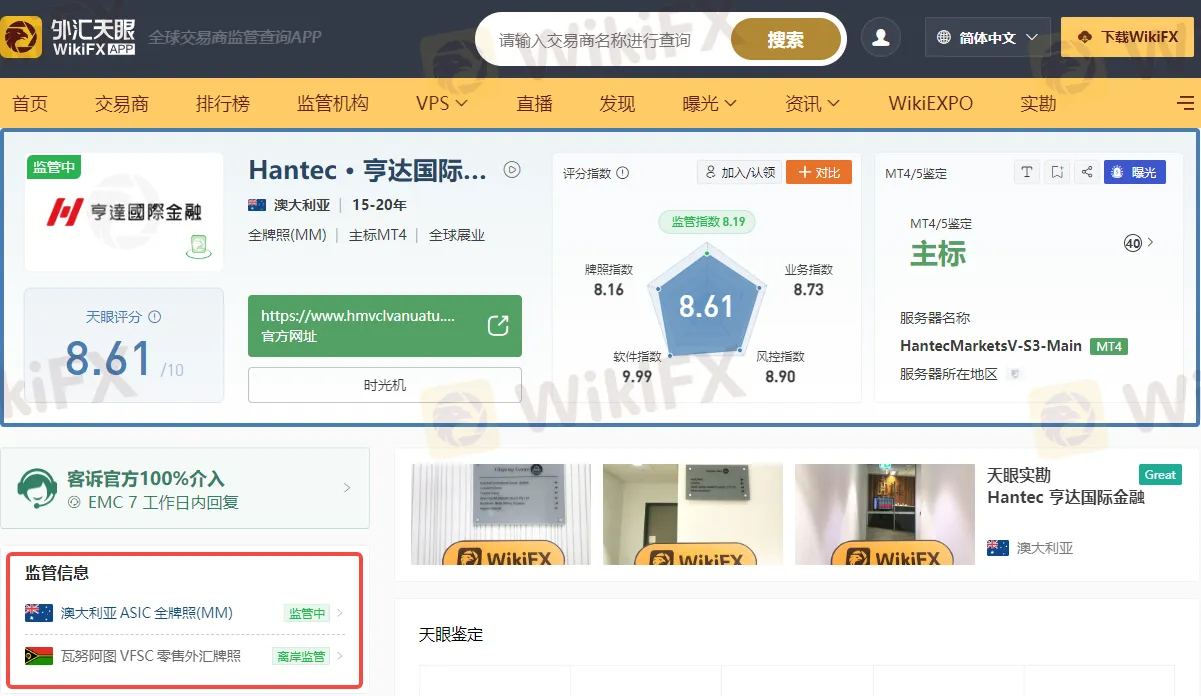 通过外汇天眼查询可知,Hantec目前受到澳大利亚证券和投资委员会(ASIC)和瓦努阿图金融服务委员会(VFSC)监管,持有澳大利亚证券和投资委员会(ASIC)全牌照(MM)以及瓦努阿图金融服务委员会(VFSC)零售外汇牌照。