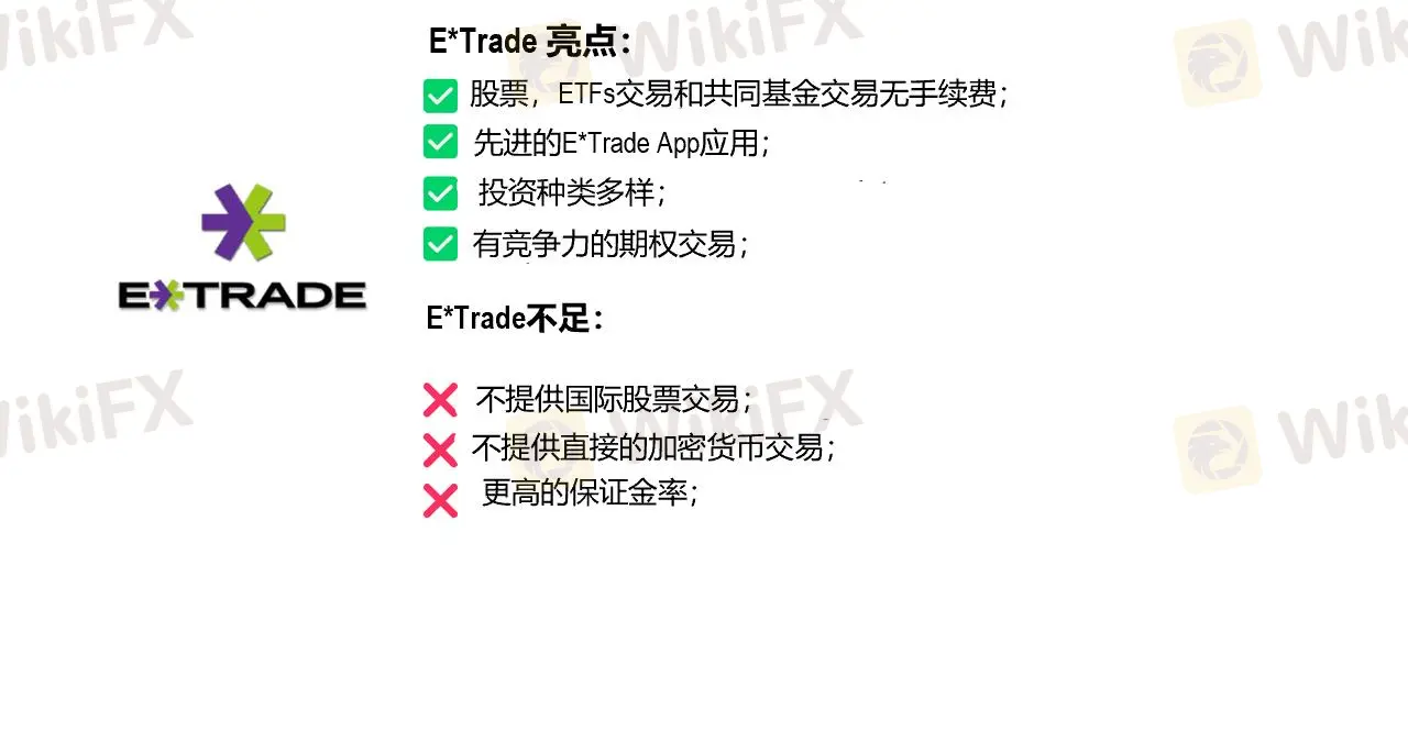 摘要:E*TRADE 是摩根士丹利旗下的在线经纪平台,为个人和机构客户提供全方位的交易和投资服务。E*TRADE成立于 1982 年,通过网页和移动交易平台提供股票、期权、交易所交易基金 (ETF)、共同基金、期货、货币和其他金融产品的交易。E*TRADE 以其简洁的界面、强大的研究工具和合理的定价策略而闻名,深受新手和经验丰富的交易者的欢迎。 E*TRADE 在免佣金股票和 ETF 交易以及全面的研究工具方面表现出色,但它并非没有细微的权衡。其优势包括具有竞争力的定价、功能丰富的移动应用程序以及针对新手和经验丰富的投资者的丰富教育资源。相反,一些缺点包括较高的期权合约费用、有限的国际股票交易以及对小额余额收取账户维护费。总体而言,E*TRADE 在竞争激烈的市场中代表着一个可靠但并非完美的在线交易解决方案。