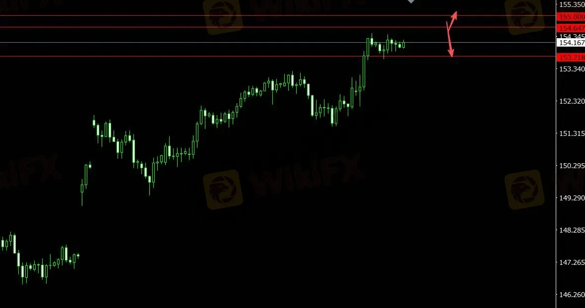 美元指数受支撑,日元上涨,关注支撑位153.720,4小时看多至155.000;关注压力位154.650,4小时看空至153.350。