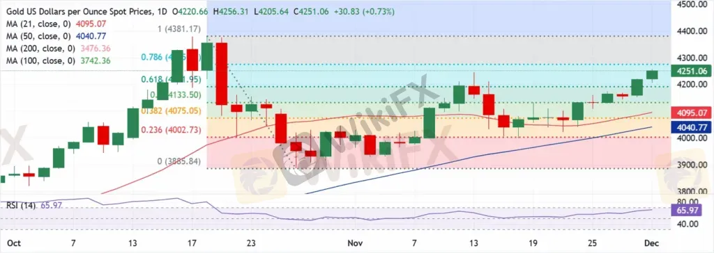 黄金日收盘价有望突破关键的 $4,250 关口,从而延续升势。