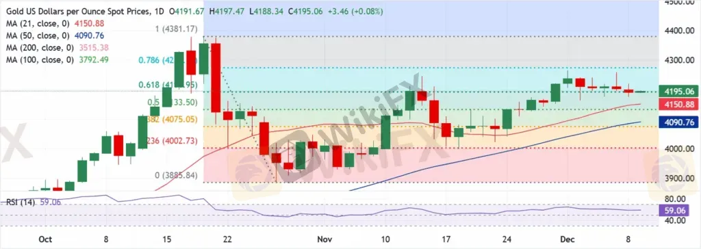 在日线图中,黄金交易于 $4,195.06。21 日、50 日、100 日和 200 日均线向前推进,较短的均线位于较长的均线之上,价格维持在所有均线之上,强化了看涨背景。21 日均线位于 $4,150.88,为附近提供动态支撑。RSI 指数为 59.06,呈正值,低于超买临界值。从$4,381.17高点到$3,885.84低点,$4,191.95的61.8%回调位是初步阻力位,上方是$4,275.16的78.6%回调位;如果持续突破,则可能向后者回升。