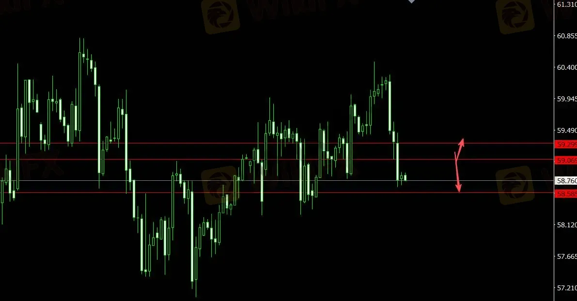美元指数承压,原油下跌,关注支撑位58.590,4小时看多至59.300;关注压力位59.070,4小时看空至58.400。