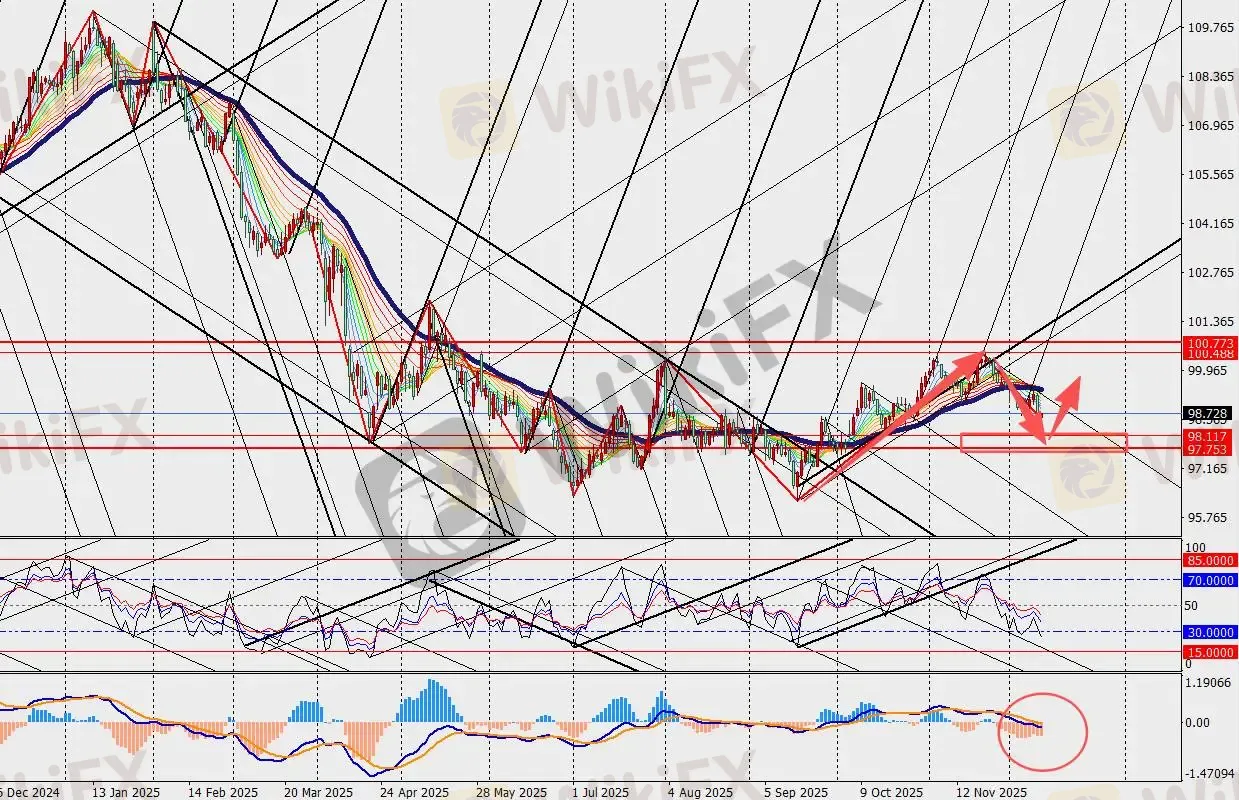 美元指数日线级别震荡下行,MACD双线和量能柱在零轴下方运行。委员会认为,准备金余额已下降至充足水平,并将按需启动购买短期美国国债,以在持续基础上维持充足的准备金供应。
