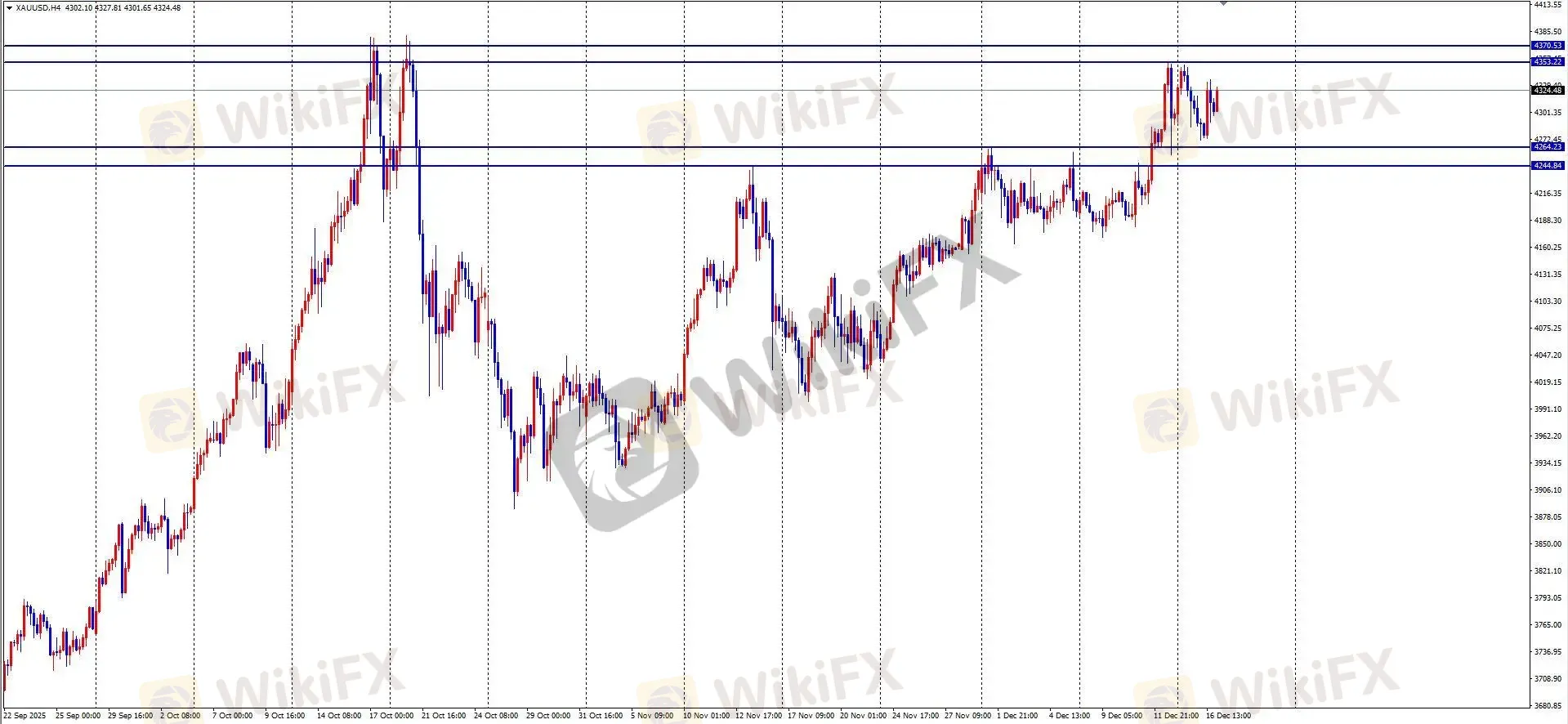 周二黄金亚盘震荡后向下突破,最低触及 4271.8 后企稳反弹。欧盘震荡下行未破前低,美盘受数据影响快速回升至 4335 附近,全天波幅约 631 点,日线收十字阴星。美国 11 月就业数据强化美联储降息预期,美元走弱支撑金价。早盘行情拉升至 4353 后呈收敛格局,4 小时 MACD 处于 0 轴上方的死叉,预示高位震荡可能延续。ETO Markets 认为,早盘已测试上方拐点线,若未能突破则暂不考虑空单,建议回调后逢低做多。