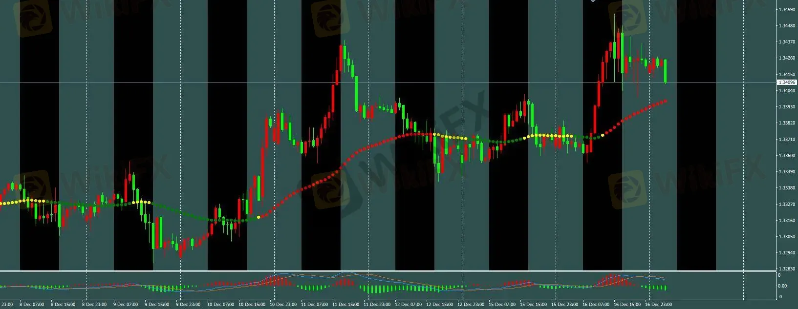 H1 三色线由黄转红,建议等待价格回调至趋势线附近入场多单,保护性止损设于 1.334 下方,盈利目标为开仓价上方 60 点,趋势线转绿即平仓。