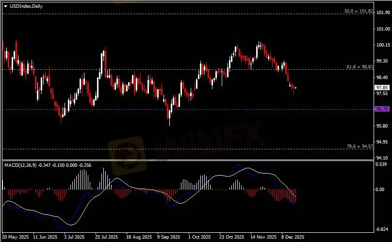 日线图显示美元指数震荡下跌,当前承压于98.80阻力。从MACD来看,快慢线向下运行,红色动能柱温和放量。指数走势基本和动能柱的变化一致。