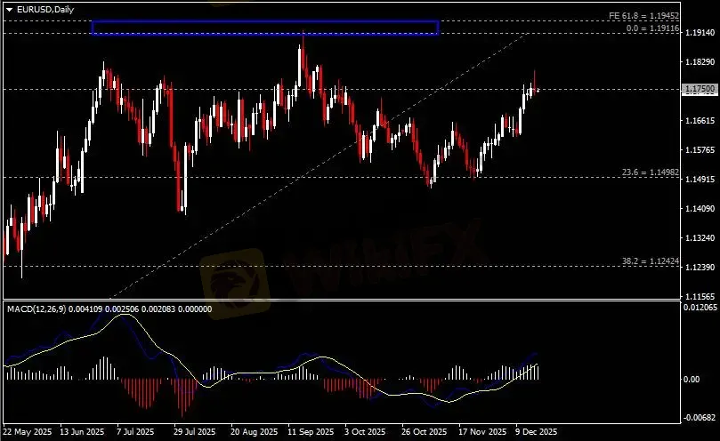 日线图显示欧元兑美元先涨后跌,当前持续测试1.1750阻力。从MACD来看,快慢线向上运行,白色动能柱则温和收缩。汇价走势基本和动能柱的变化一致。