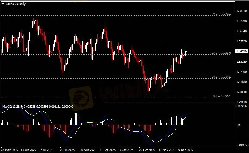 日线图显示英镑兑美元震荡走强,当前收于前高1.3390。从MACD来看,快慢线向上运行,白色动能柱则温和收缩。汇价走势和动能柱的变化呈分歧。