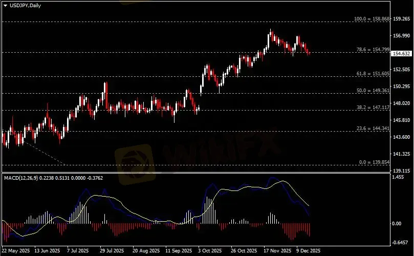 日线图显示美元兑日元震荡下跌,当前回测试154.80支撑。从MACD来看,快慢线向下运行,红色动能柱温和放量。汇价走势基本和动能柱的变化一致。
