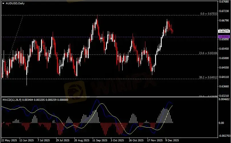 日线图显示澳元兑美元回调下挫,当前仍收于0.66关键支撑。从MACD来看,快慢线呈拐向,白色动能柱温和收缩。汇价走势基本和动能柱的变化一致。