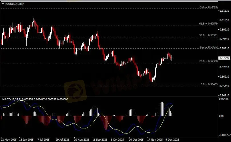 日线图显示纽元兑美元小幅反弹,当前收于0.5740支撑。从MACD来看,快慢线呈拐向,白色动能柱温和收缩。汇价走势和动能柱的变化呈分歧。
