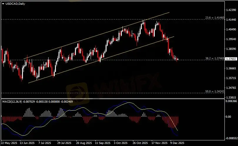 日线图显示美元兑加元震荡下跌,当前测试1.3750支撑。从MACD来看,快慢线向下运行,红色动能柱则温和收缩。汇价走势和动能柱的变化呈分歧。