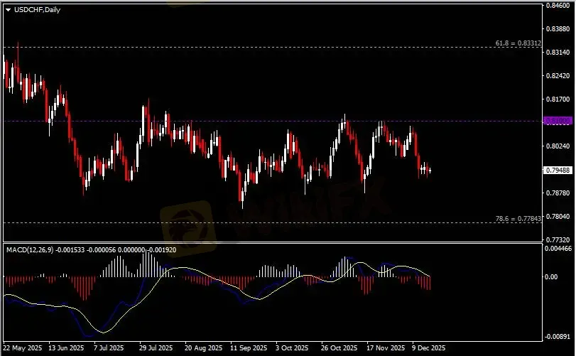 日线图显示美元兑瑞郎震荡下跌,当前承压于0.81关键阻力。从MACD来看,快慢线向下运行,红色动能柱温和放量。汇价走势基本和动能柱的变化一致。