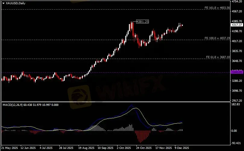 日线图显示金价涨势暂缓,当前仍收于4040支撑。从MACD来看,快慢线向上运行,白色动能柱略呈平行。金价走势基本和动能柱的变化一致。