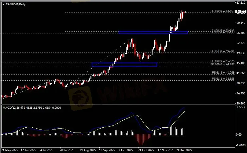 日线图显示银价小幅承压于63.90阻力。从MACD来看,快慢线向上运行,白色动能柱则温和收缩。银价走势基本和动能柱的变化一致。