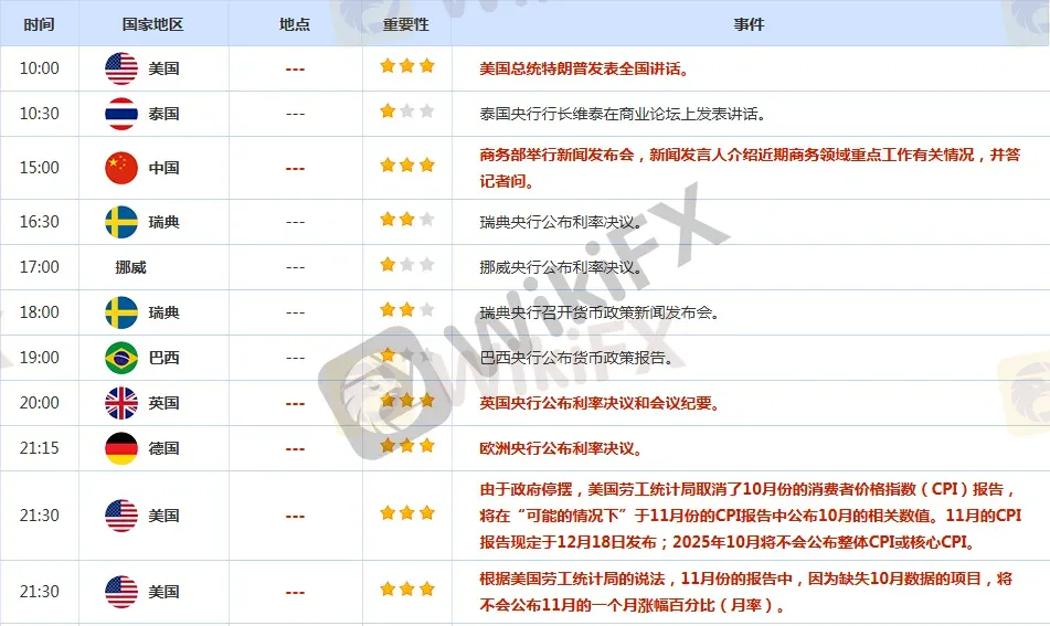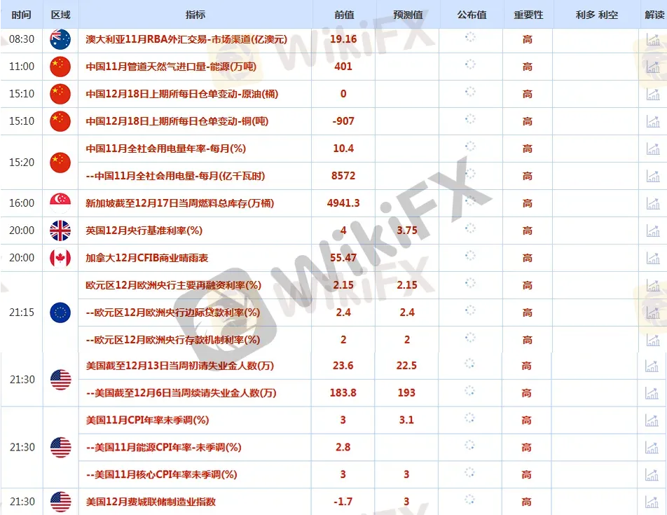 11月消费者价格指数(CPI)同比涨幅从10月的3.6%大幅降至3.2%,为3月份以来最低水平。该数据消除了市场对英国央行在周四会议上是否采取行动的疑虑,利率期货市场显示,交易员们几乎完全定价央行将宣布降息25个基点。与此同时,美元指数上涨0.16%至98.37。美元的反弹部分得益于其作为避险资产的属性,因为交易员在多家全球主要央行即将公布利率决议前态度趋于谨慎。市场普遍预期欧洲央行将维持利率不变,而日本央行可能在周五宣布加息,预计日本央行将把利率上调至30年来最高。美联储官员内部的观点分歧也成为市场焦点。理事沃勒暗示,鉴于就业市场疲软的迹象,美联储仍有降息空间。而亚特兰大联储主席博斯蒂克则持相反观点,认为上周的降息决定并不合理,并预计2026年不会进一步放松政策。展望后市,交易员的注意力已转向即将公布的多项数据与决策,包括周四的美国CPI数据、英国央行与欧洲央行利率决议,以及周五的日本央行会议,这些事件都可能引发市场新一轮波动。