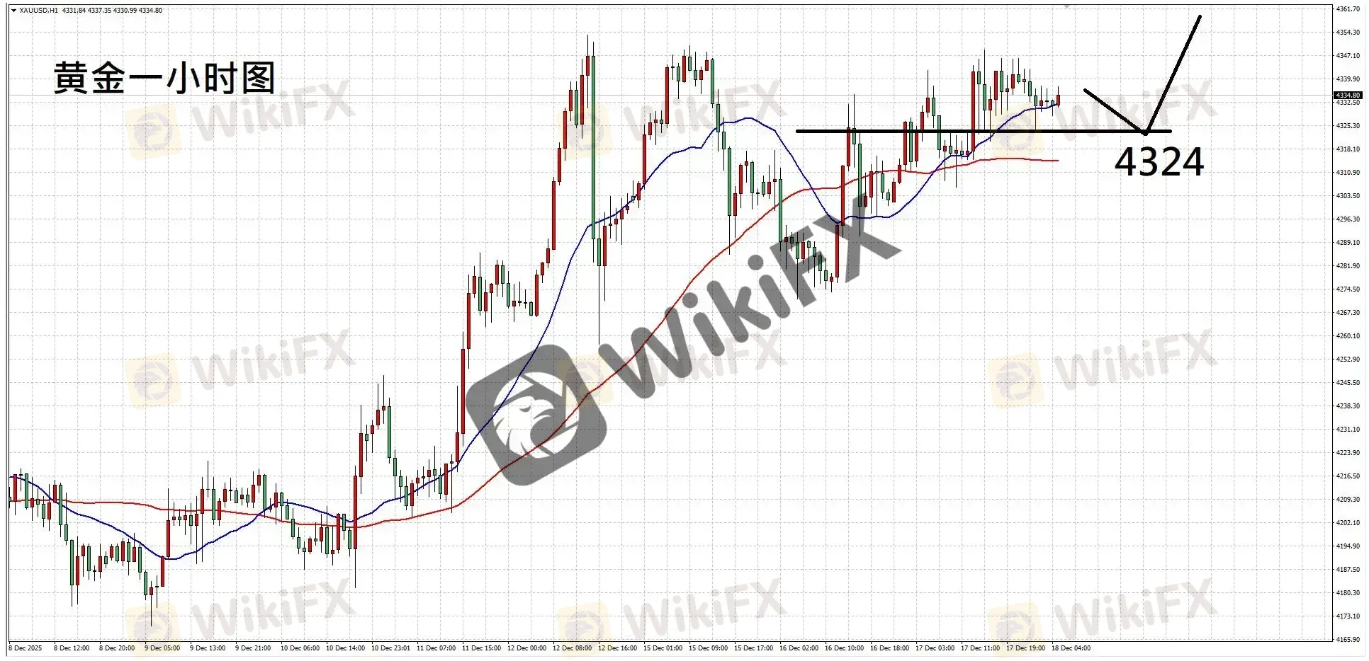 摘要:【基本面分析】近期美国就业市场出现放缓迹象,市场对降息的预期随之升温;就当前定价来看,投资者对明年累计 50 个基点的降息预期仍未动摇。地缘局势方面,美国总统特朗普下令封锁所有进出委内瑞拉且受制裁的油轮,紧张情势再起,为金价提供支撑。展望后市,今晚将公布美国初请失业金与通胀数据,若就业持续走弱且通胀变化有限,降息预期有望进一步强化,黄金走势或获得续航。【技术分析】黄金一小时图,走势相对高低点持续抬