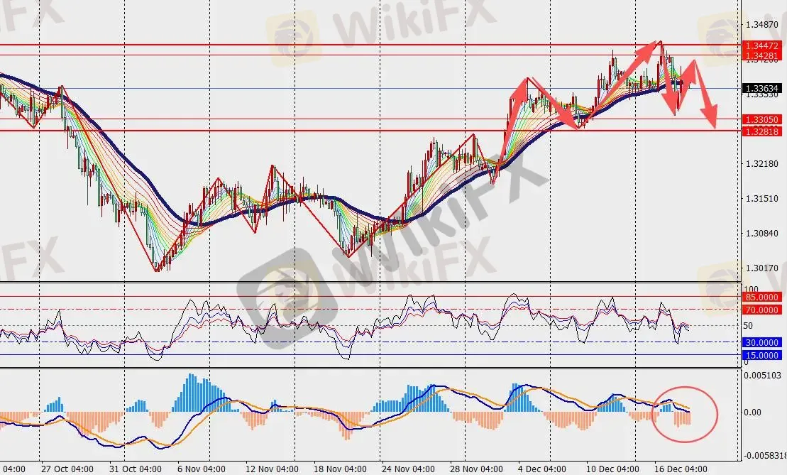 技术面:英镑兑美元H4级别遇阻回落,并在48日多空分界线附近运行。此外,MACD双线和量能柱在零轴附近扩张。市场预期英国整体通胀率或小幅回落,但核心通胀率与服务业通胀率仍将维持黏性。