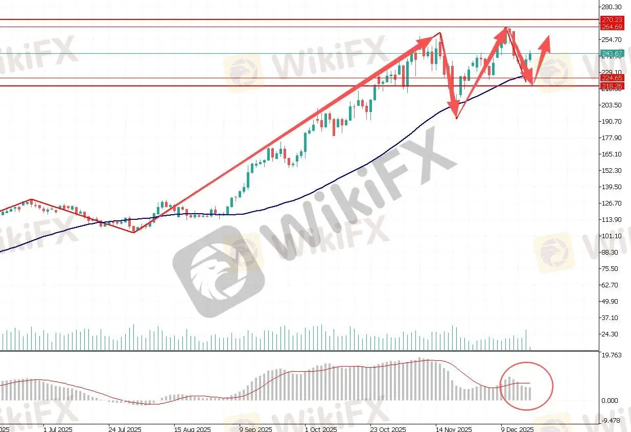 技术面:美光日线级别高位反弹,并在48日多空分界上方运行。此外,MACD双线和量能柱在零轴附近扩张。美光科技股价走势自今年下半年以来迈入狂飙模式,推动该股今年以来疯涨超170%。