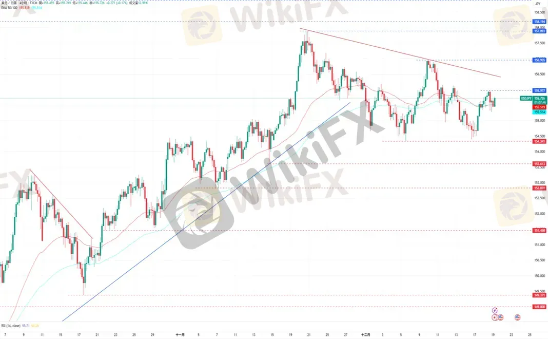 美元/日元继续延续着157.893开始的下跌修正,目前价格尝试站稳在EMA50均线上方。上涨方面,美元/日元接下来的阻力12月9日的高点156.955,再来是11月19日的高点157.893。下跌方面,美元/日元初步的支撑为12月16日的低点154.394,再来是11月14日的低点153.613。
