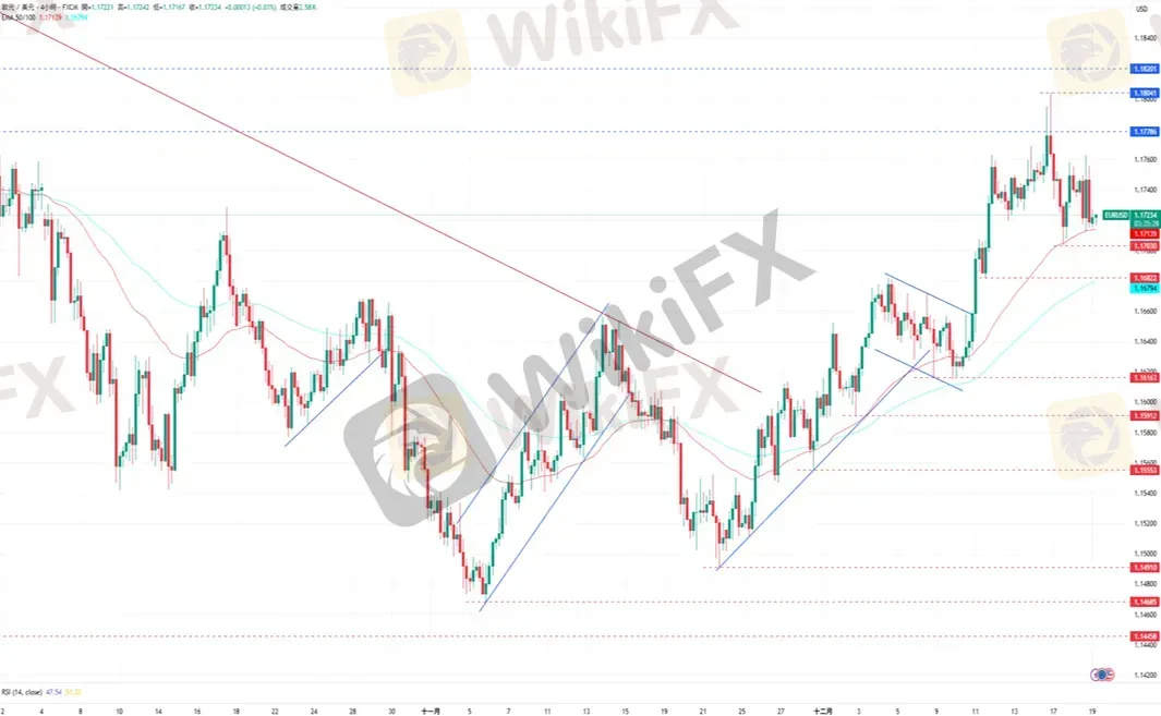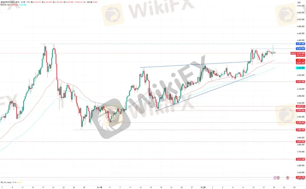 黄金价格继续保持在4353美元下方波动,当日价格一度上涨至4375美元,受下方EMA50均线的支撑,目前黄金的前景仍偏向看涨。上涨方面,黄金目前的阻力为12月12日的高点4353美元,再来是10月21日高点4381美元。下跌方面,黄金目前的支撑为12月16日的低点4271美元,再来是12月2日的低点4163美元。