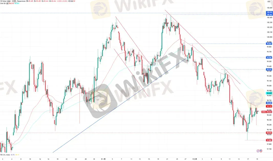 CPT Markets分析师指出,美元指数保持在96.468下方震荡,由于价格仍保持在EMA50下方移动,因此走势仍偏向看跌。下跌方面,美元指数接下来的支撑为12月18日的低点98.189,接着是12月16日的低点97.882。上涨方面,美元指数目前的阻力为12月17日的高点98.648,再来是12月19日的高点99.337。